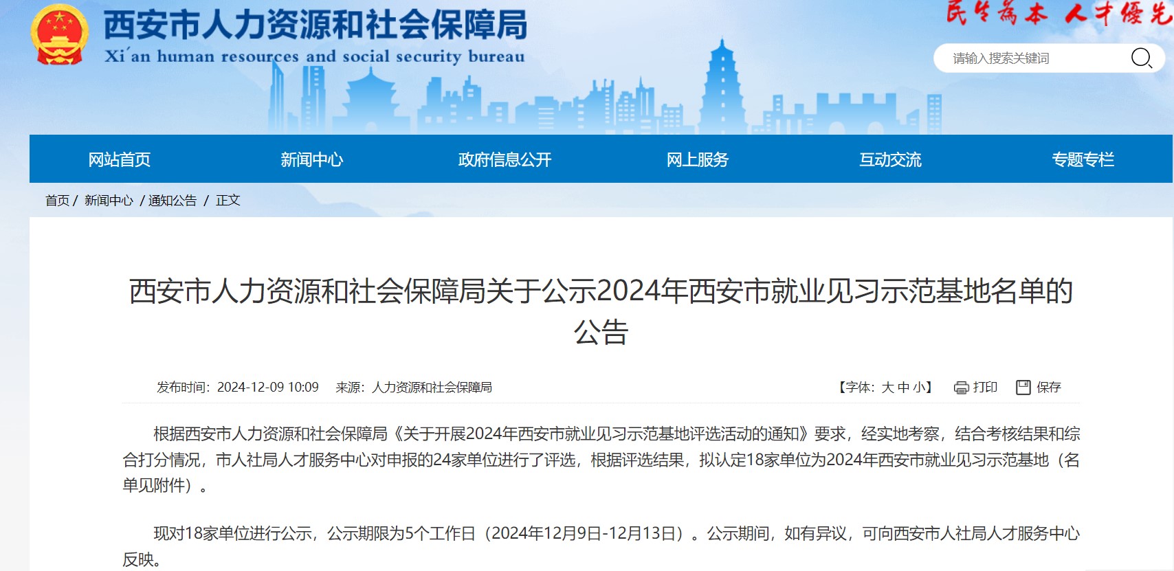2024年12月9日,西安市人力資源和社會保障局發布《關于公示2024年西安市就業見習示范基地名單的公告》,公司成功獲評為“西安市就業見習示范基地”!